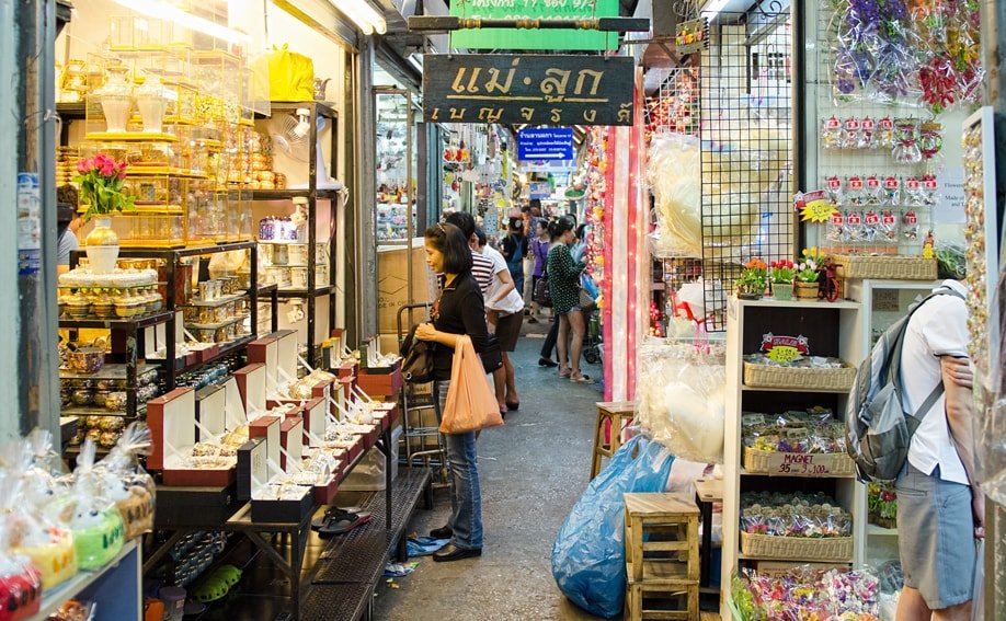 Connu sous le nom de JJ Market par la plupart des habitants (le nom officiel, Chatuchak, se prononce avec un son J), c'est l'ancêtre de tous les marchés : avec 15 000 étals, c'est l'un des plus grands marchés en plein air au monde. Tout est achetable, des objets pratiques comme la décoration intérieure, l'art, les vêtements, les accessoires et le matériel de cuisine, aux bibelots et aux bizarreries comme les imitations de Nike et Beats by Dre, les coques d'iPhone et, oui, même les animaux vivants. Malgré sa taille, le marché est très bien organisé, avec des marchandises classées par type et une grande carte affichée près de l'entrée.